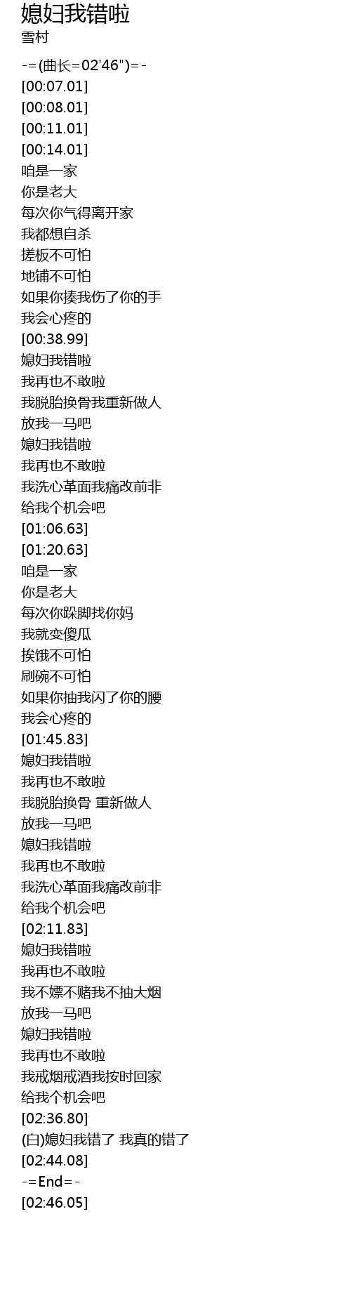 | [02:37.80] | (白)媳妇我错了 我真的错了 |