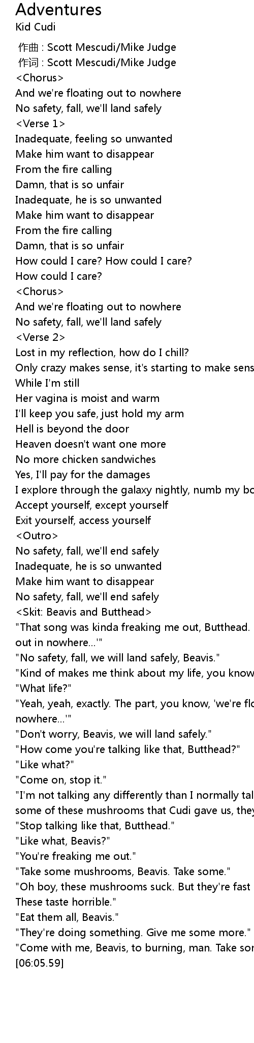 | [04:21.34] | " That song was kinda freaking me out, Butthead. ' And we' re floating out in nowhere...'" |