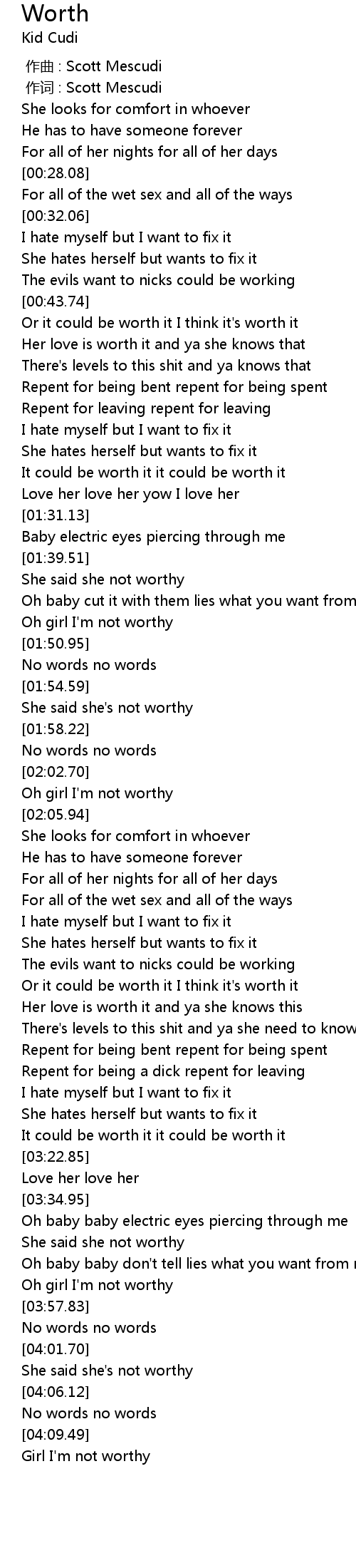 | [01:40.10] | She said she not worthy |