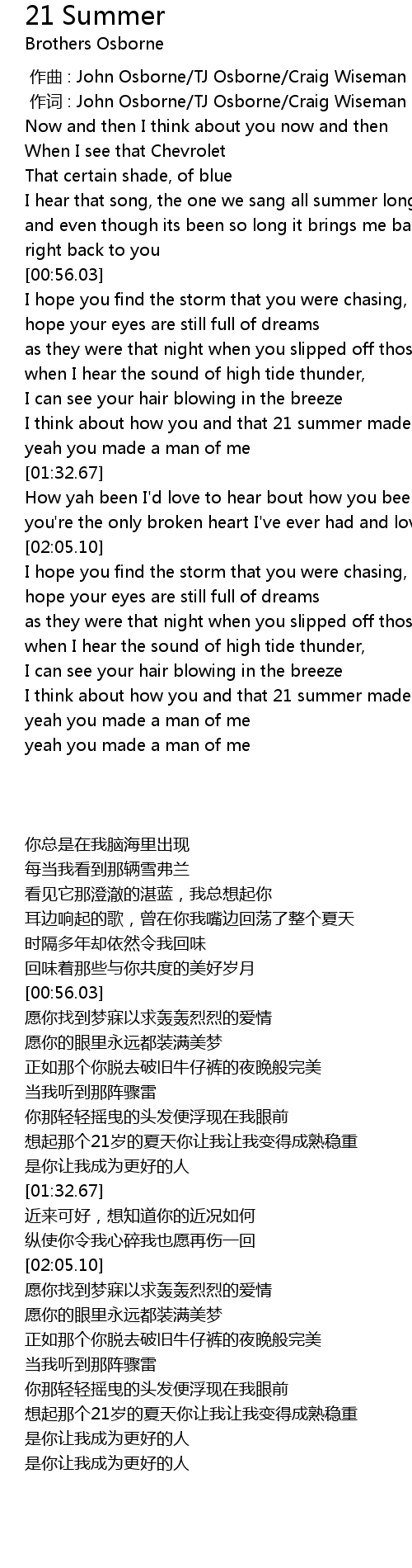 | [00:01.00] | 作词 : John Osborne/TJ Osborne/Craig Wiseman |