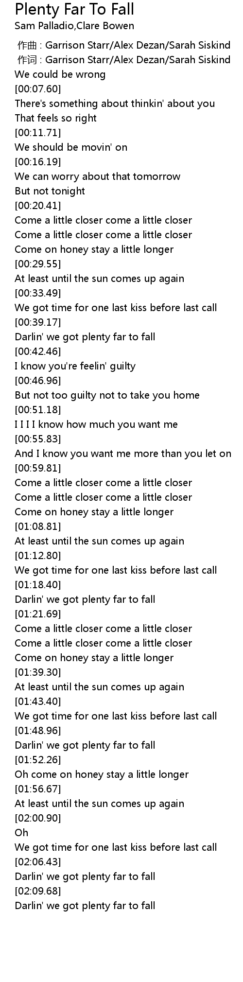 | [02:11.38] | Darlin' we got plenty far to fall |