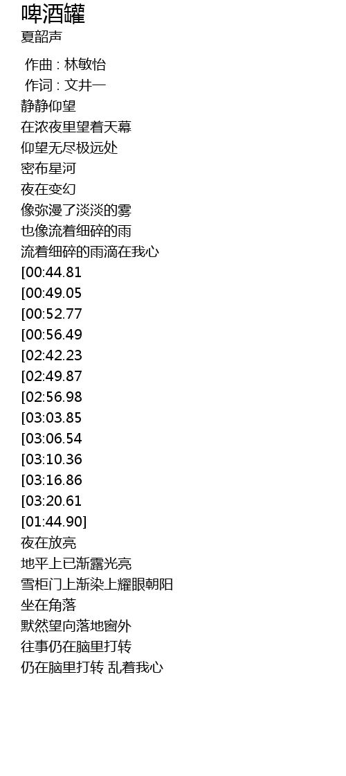 | [02:24.86][00:44.81] | 拿着喝尽了的啤酒罐 |
