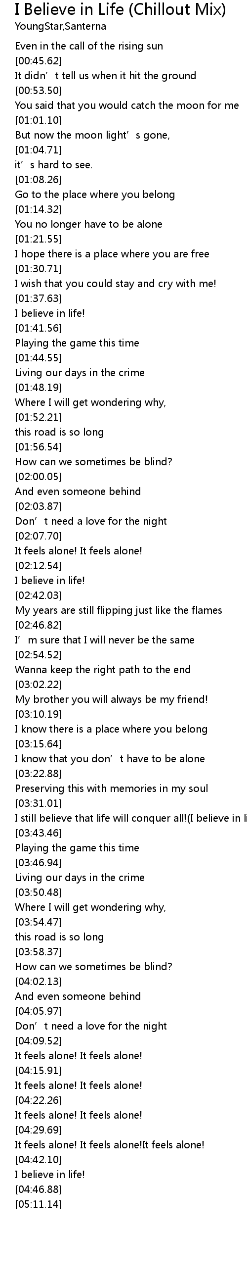 | [04:31.52] | It feels alone! It feels alone!It feels alone! |