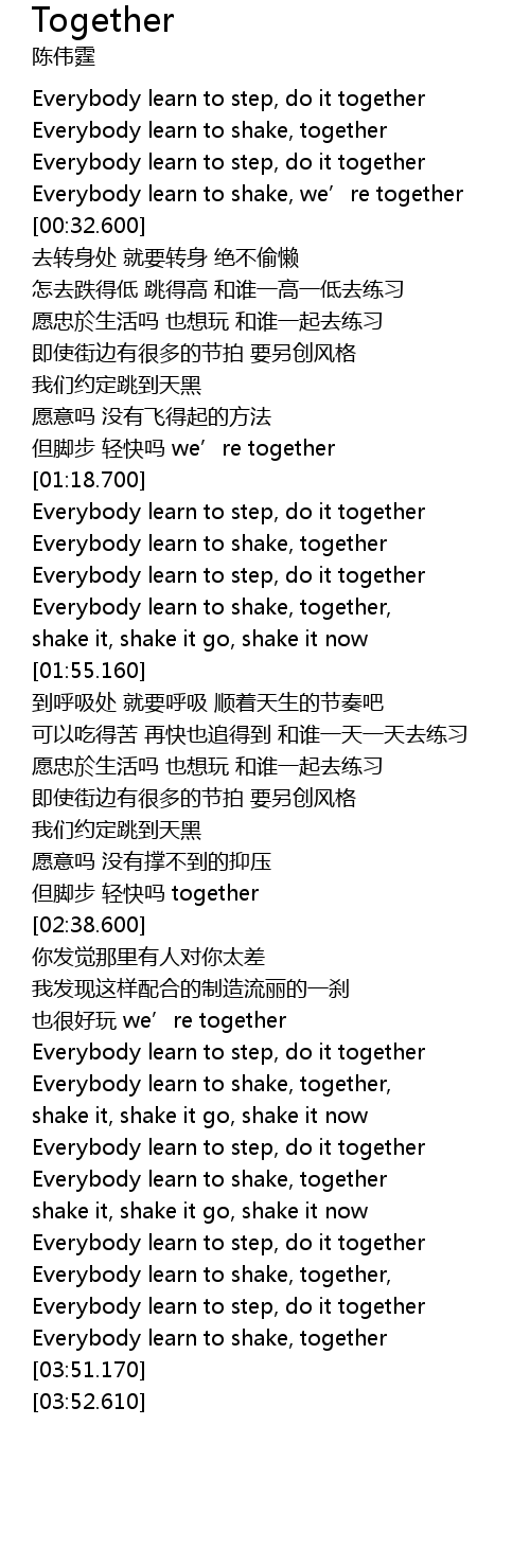 | [03:09.100] | Everybody learn to step, do it together |