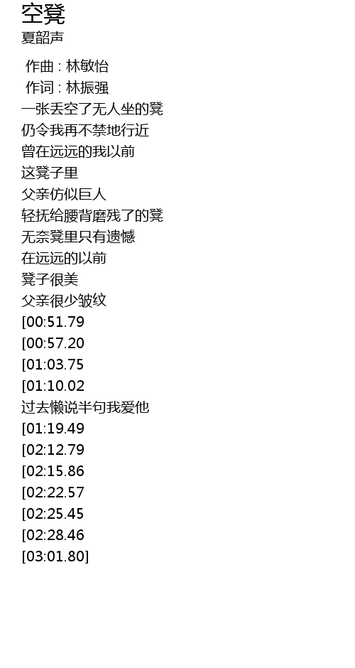 | [01:42.18][00:51.79] | 独望着空凳原我能 |