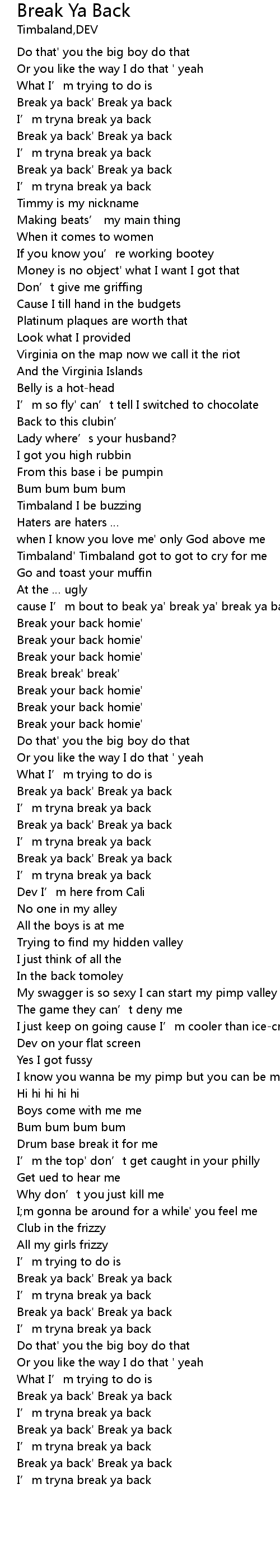 | [01:14.28] | cause I' m bout to beak ya' break ya' break ya back honey |