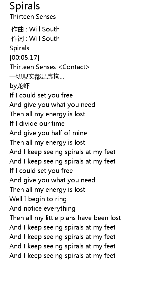 | [01:15.93] | And I keep seeing spirals at my feet |