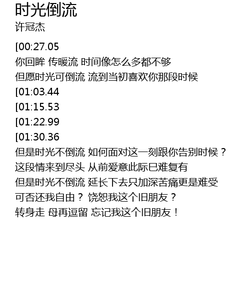 | [02:26.16][00:27.05] | 但愿时光可倒流 流到当初相识你那段时候 |