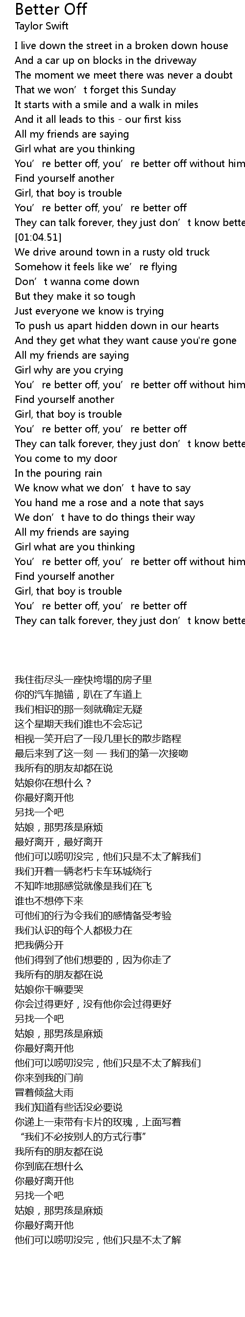 | [00:44.44] | You' re better off, you' re better off without him. |