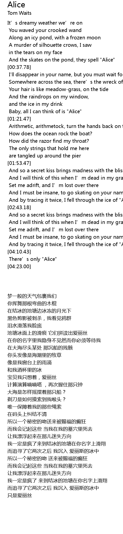 | [00:29.53] | And the skates on the pond, they spell "Alice" |