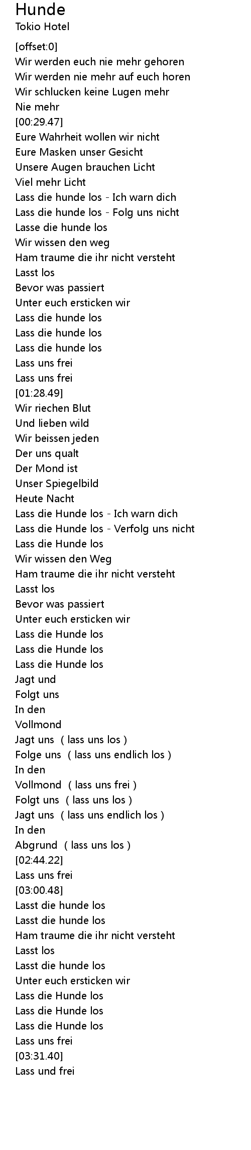 | [03:01.18] | Lasst die hunde los |