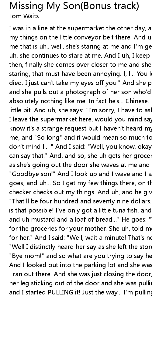 I was in a line at the supermarket the other day, and uhm... y'know, I had all my things on the little conveyor belt there. And uh... there's a gal in front of me that is uh.. well, she's staring at me and I'm getting a little nervous and uh, she continues to stare at me. And I uh, I keep looking the other way. And then, finally she comes over closer to me and she says: "I apologize for staring, that must have been annoying. I, I... You look so much like my son, who died. I just can't take my eyes off you." And she precedes to go into her purse and she pulls out a photograph of her son who'd died. And uh, he looks absolutely nothing like me. In fact he's... Chinese. Uh... anyway, we chatted a little bit. And uh, she says: "I'm sorry, I have to ask you. Would you mind, as I leave the supermarket here, would you mind saying "Goodbye mom" to me? I, I know it's a strange request but I haven't heard my son saying "Goodbye mom" to me, and "So long" and it would mean so much to me to hear it. And uh, if you don't mind I... " And I said: "Well, you know, okay, yeah, sure. Eh.. uh... I can say that." And, and so, she uh gets her groceries all checked out. And uh, as she's going out the door she waves at me and she hollers across the store: "Goodbye son!" And I look up and I wave and I say: "Goodbye mom!" And then she goes, and uh... So I get my few things there, on the conveyor belt and the checker checks out my things. And uh, and he gives me the total and he says: "That'll be four hundred and seventy nine dollars." Uh... and I said: "Well, how is that possible! I've only got a little tuna fish, and uh some skimmed milk, and uh mustard and a loaf of bread..." He goes: "Well, well you're also paying for the groceries for your mother. She uh, told me you'd take care of the bill for her." And I said: "Well, wait a minute! That's not my mother!" And he says: "Well I distinctly heard her say as she left the store "Bye son!" and you said "Bye mom!" and so what are you trying to say here, uh..." I said: "Well, JESUS!" And I looked out into the parking lot and she was just getting into her car. And I ran out there. And she was just closing the door, and she had a little bit of her leg sticking out of the door and she was pulling away and I grabbed her leg and I started PULLING it! Just the way... I'm pulling yours... |