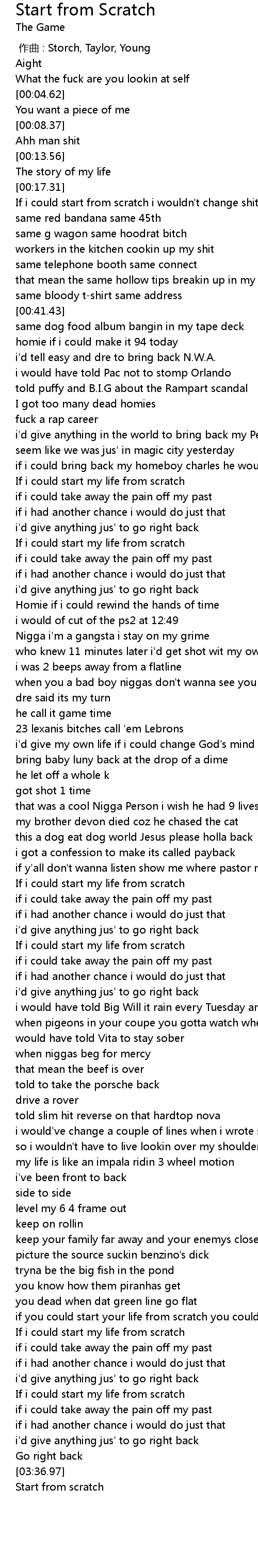 | [00:19.74] | If i could start from scratch i wouldn' t change shit |