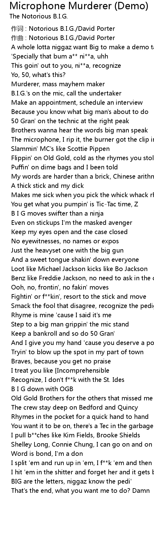 | [00:00.097] | A whole lotta niggaz want Big to make a demo tape |