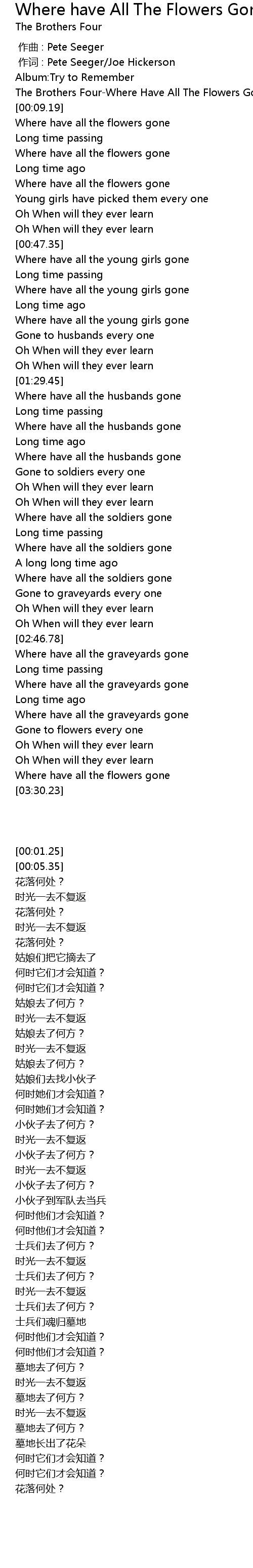 | [00:01.25] | The Brothers FourWhere Have All The Flowers Gone |