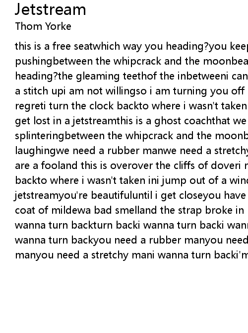 this is a free seatwhich way you heading?you keep pushing and you keep pushingbetween the whipcrack and the moonbeamsi said coachman where we heading?the gleaming teethof the inbetweeni can hear some people laughingis this a stitch upi am not willingso i am turning you off and then i'm countingi regreti turn the clock backto where i wasn't taken ini jump out of the windowand get lost in a jetstreamthis is a ghost coachthat we are ridingdamp decay and splinteringbetween the whipcrack and the moonbeamsi can hear some people laughingwe need a rubber manwe need a stretchy mani'm not sure i am welcomeyou are a fooland this is overover the cliffs of doveri regreti turn the clock backto where i wasn't taken ini jump out of a windowand get lost in a jetstreamyou're beautifuluntil i get closeyou have the eyes of a mountain goata coat of mildewa bad smelland the strap broke in my handnow i wanna turn backi wanna turn backturn backi wanna turn backi wanna turn backturn backturn backi wanna turn backyou need a rubber manyou need a stretchy manyou need a rubber manyou need a stretchy mani wanna turn backi'm on my backturn back