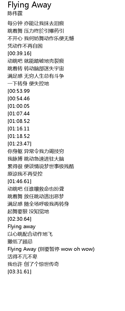 | [03:15.45] | Flying Away bie yao zan ting wow oh wow |
