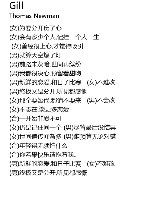 | [01:22.99] | (男)新鲜的恋爱,和日子比赛 (女)不难改 |