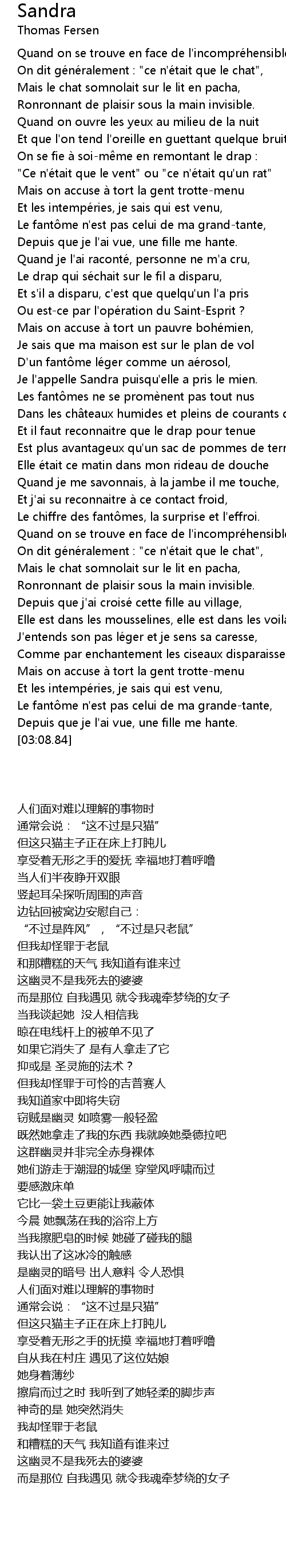 | [01:24.20] | Je l'appelle Sandra puisqu'elle a pris le mien. |