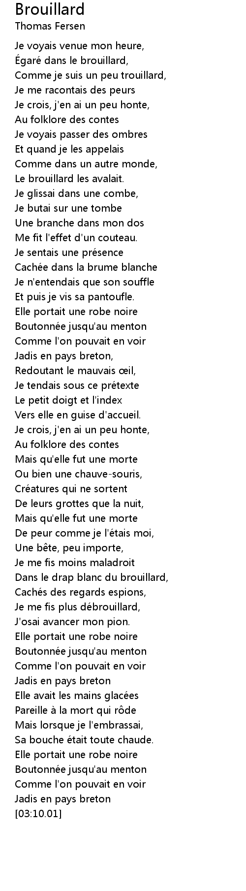 | [02:20.67] | Je me fis plus dé brouillard, |