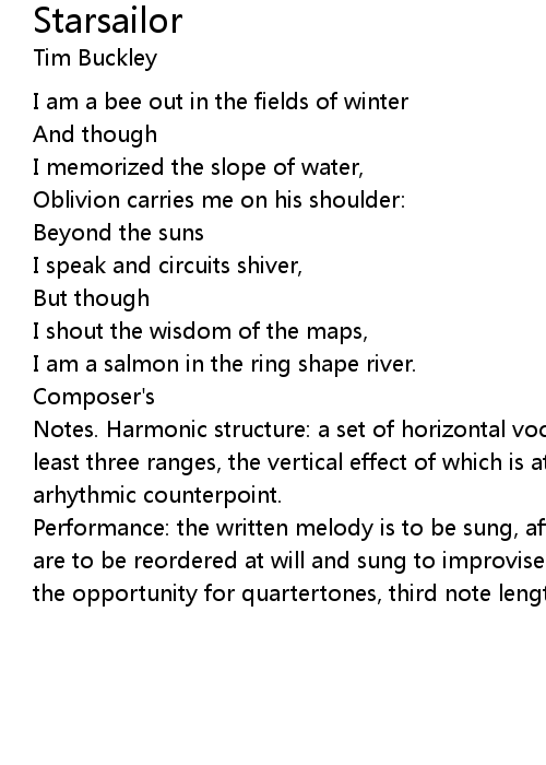 Performance: the written melody is to be sung, after which the lines of lyric are to be reordered at will and sung to improvised melody, taking advantage of the opportunity for quartertones, third note lengths, and flexible tempo.