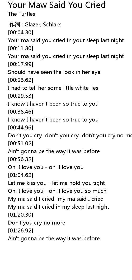 | [00:15.01] | Your ma said you cried in your sleep last night |