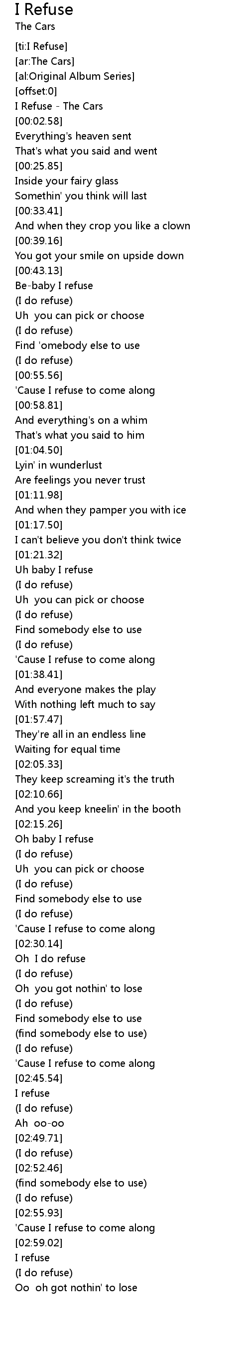 [00:00.86] I Refuse - The Cars