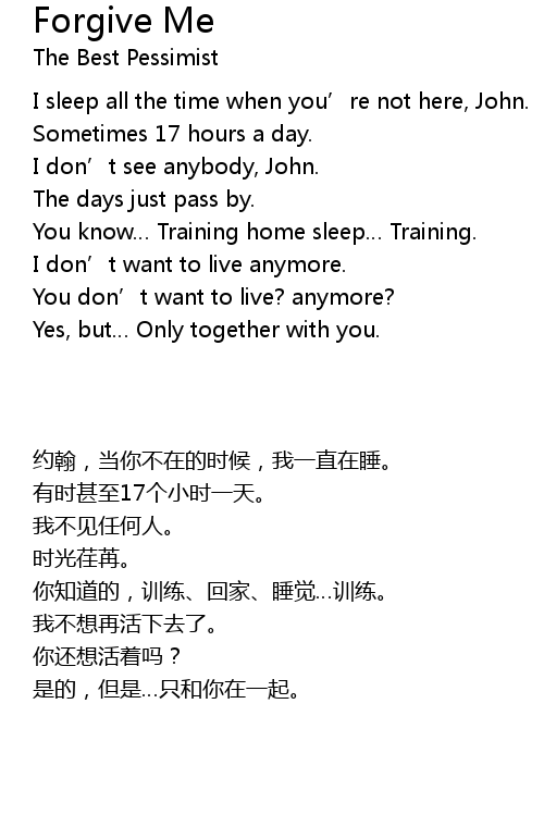 | [00:13.97] | I sleep all the time when you' re not here, John. |