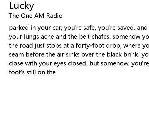 | parked in your car, you're safe, you're saved. and though your hands shake and your lungs ache and the belt chafes, somehow you're still safe. four feet up, the road just stops at a forty-foot drop, where your high beams catch the last seam before the air sinks over the black brink. you must have dozed. you came so close with your eyes closed. but somehow, you're alive now, and wide awake. your foot's still on the |