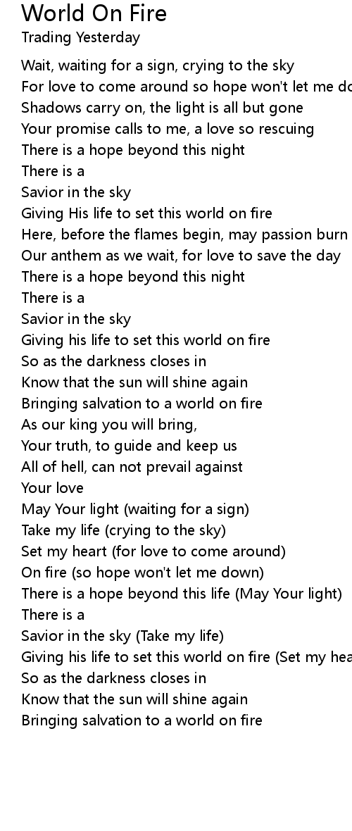 Giving his life to set this world on fire (Set my heart on fire) |