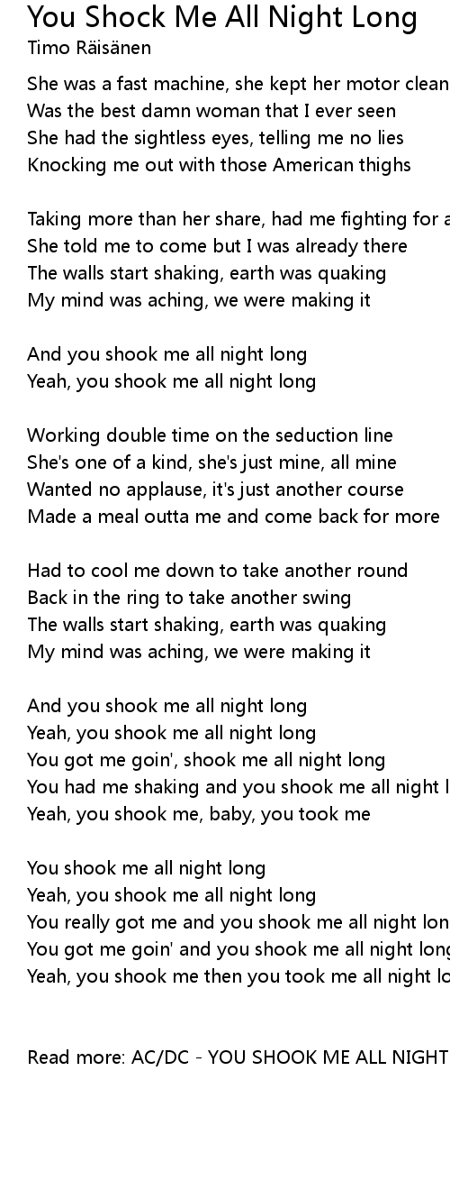 | Read more: AC DC YOU SHOOK ME ALL NIGHT LONG LYRICS |