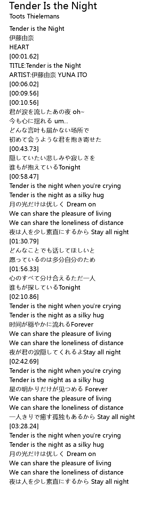 | [03:29.19] | Tender is the night when you're crying |