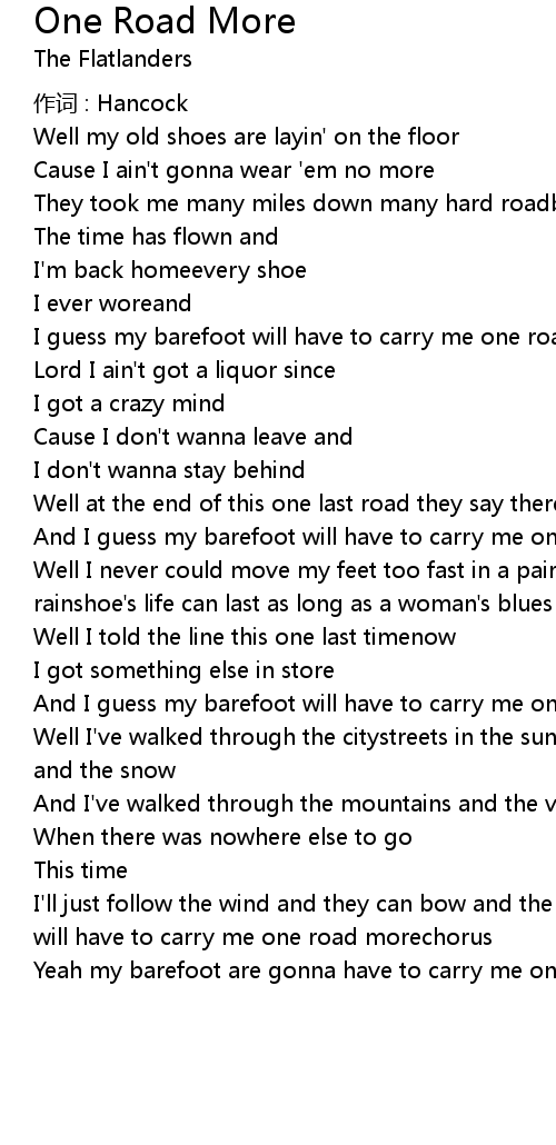 | And I guess my barefoot will have to carry me one road morechorus | |