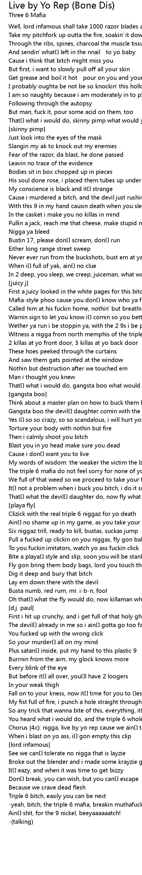 | yeah, bitch, the triple 6 mafia, breakin muthafuckin bones like it | |
