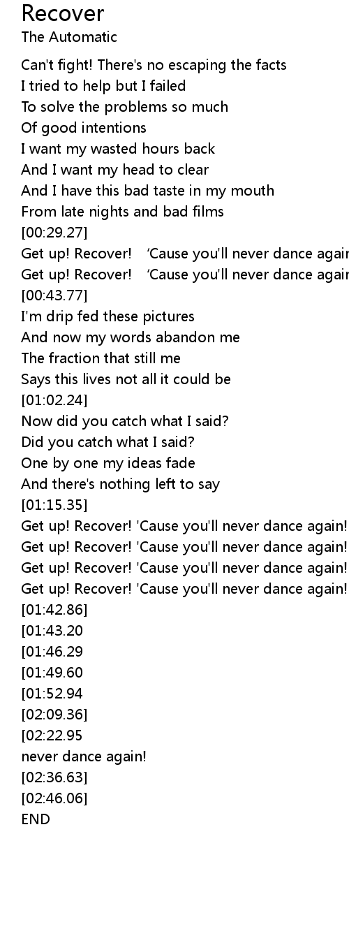 | [02:29.54][02:22.95][02:25.24][02:16.20][02:09.82] | Get up! Recover! Cause you' ll never dance again! |