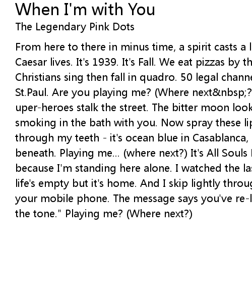 From here to there in minus time, a spirit casts a line to fish alternatives and Caesar lives. It's 1939. It's Fall. We eat pizzas by the pool...we watch the Christians sing then fall in quadro. 50 legal channels, this one sponsored by St.Paul. Are you playing me? (Where next ?) Year sub-zero here in Baghdad,s uper-heroes stalk the street. The bitter moon looks down and laughs while I lie smoking in the bath with you. Now spray these lips with superglue, I'm lying through my teeth - it's ocean blue in Casablanca, but it's burned out black beneath. Playing me... (where next?) It's All Souls Night. I'm frightened because I'm standing here alone. I watched the last bus fly to Brighton. Now life's empty but it's home. And I skip lightly through the garbage, call you on your mobile phone. The message says you've re-located. "Leave a message...here's the tone." Playing me? (Where next?) |