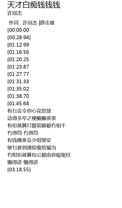 | [02:11.86][01:12.99][00:29.16] | 成日要钱多 |