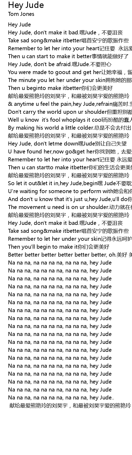 | Hey Jude, don' t make it bad. hēi Jude, bú yào jǔ sàng | |