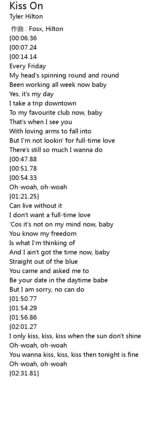 | [03:06.73][00:54.33] | You wanna kiss, kiss, kiss then tonight is fine |