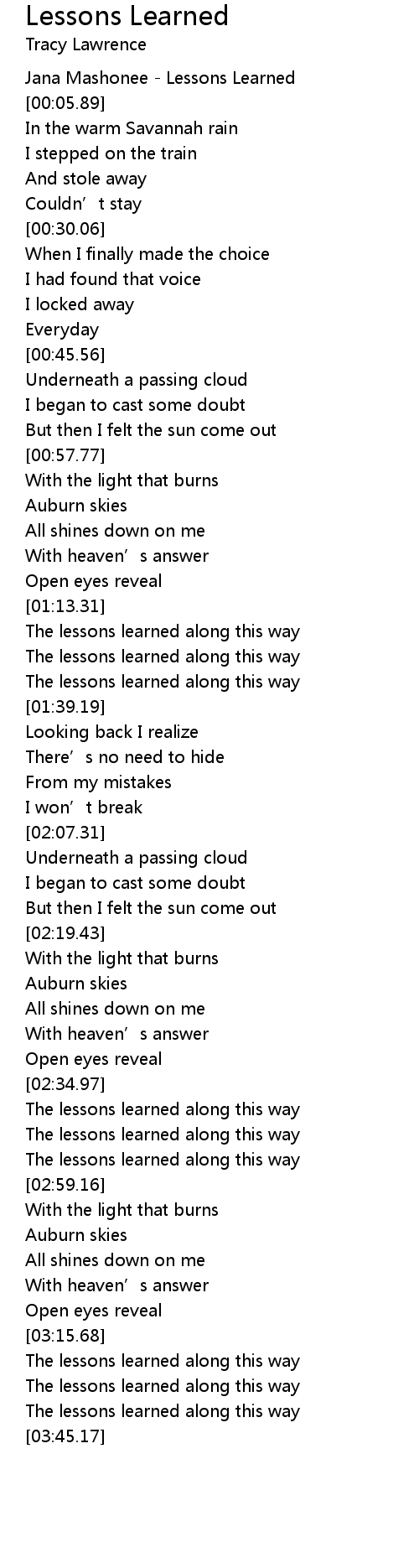 | [00:01.12] | Jana Mashonee Lessons Learned |