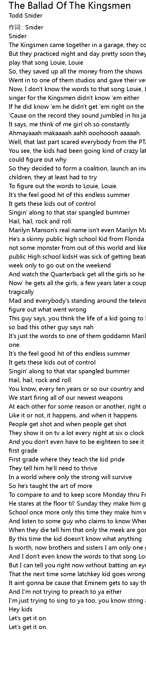 | Song | The Ballad Of The Kingsmen |