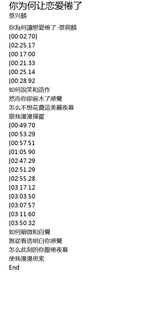 | [00:00.00] | 你為何讓戀愛倦了-蔡興麟 |