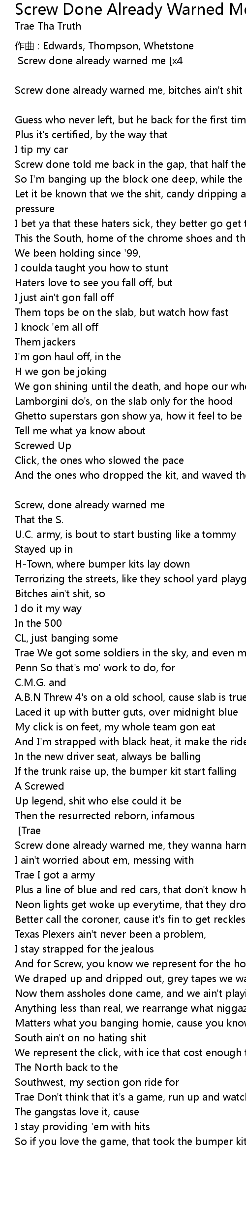 | Screw done told me back in the gap, that half these bitches wasn' t shit | |