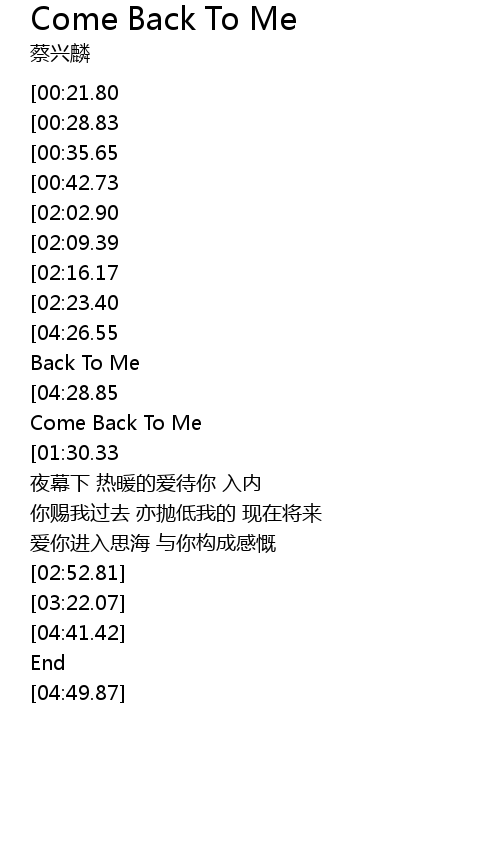 | [04:33.36][04:26.55][04:19.66][04:12.86][04:06.09][03:57.44][03:50.70][01:23.71][01:16.67] | Come Back To Me |