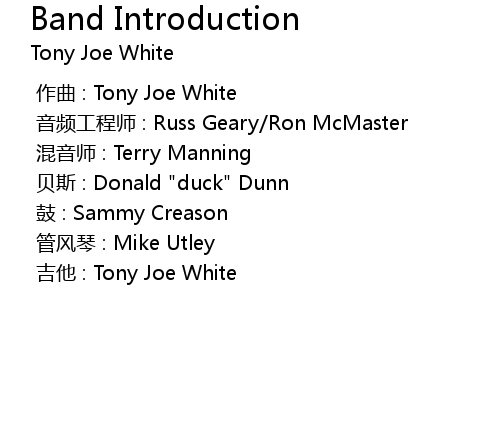 | [00:00.000] | zuò qǔ : Tony Joe White |