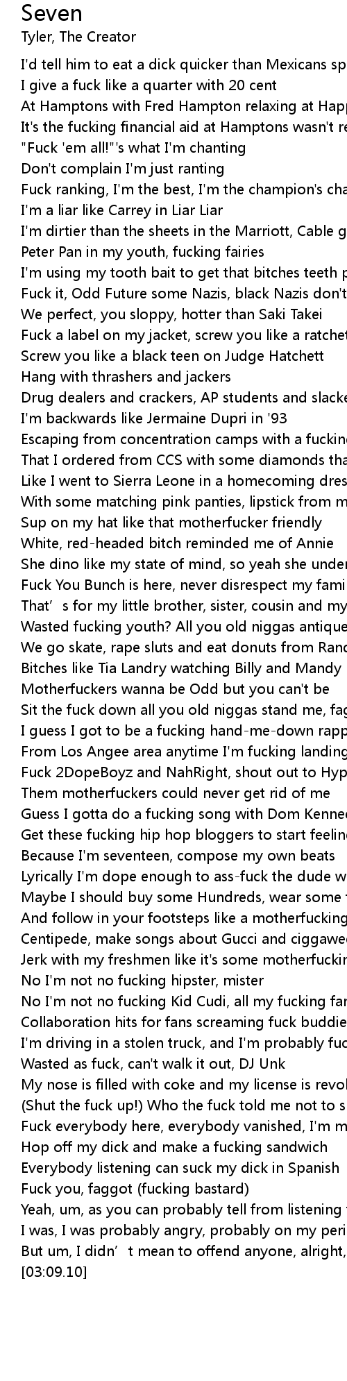 | [01:18.94] | We go skate, rape sluts and eat donuts from Randy |