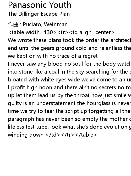 | I profit high noon and there ain' t no secrets no more excuses now our number' s up let them lead us by the throat now just smile while the rope pulls tighter guilty is an understatement the hourglass is never right side up and all the time we try to tear the script up forgetting all the sour for the sweet the paragraph has never been so empty the mother dies with infant in arms the lifeless test tube, look what she' s done evolution gave us a clock that' s always winding down td tr table |