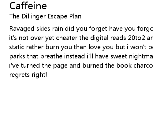 | Ravaged skies rain did you forget have you forgotten liar did you forget cause it's not over yet cheater the digital reads 20to2 and the radio is screaming static rather burn you than love you but i won't be fooled into dreaming of parks that breathe instead i'll have sweet nightmares of you these days are over i've turned the page and burned the book charcoal circles around your eyes no regrets right! |