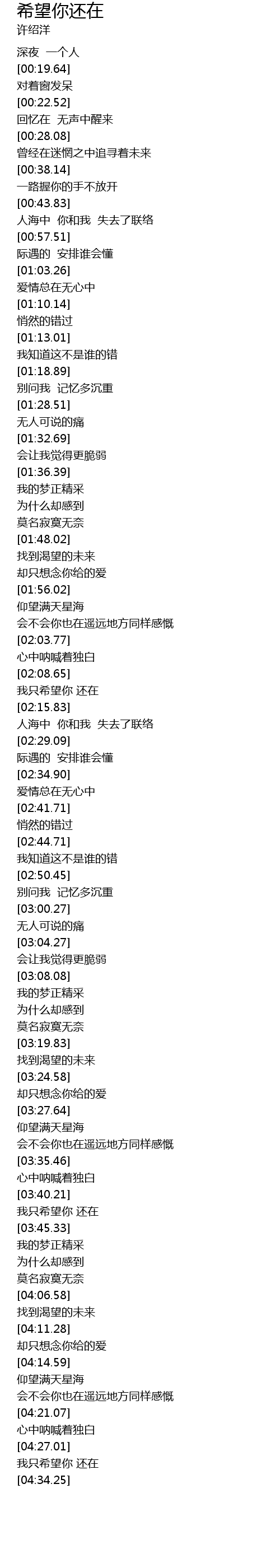 | [03:41.34] | wǒ zhǐ xī wàng nǐ hái zài |