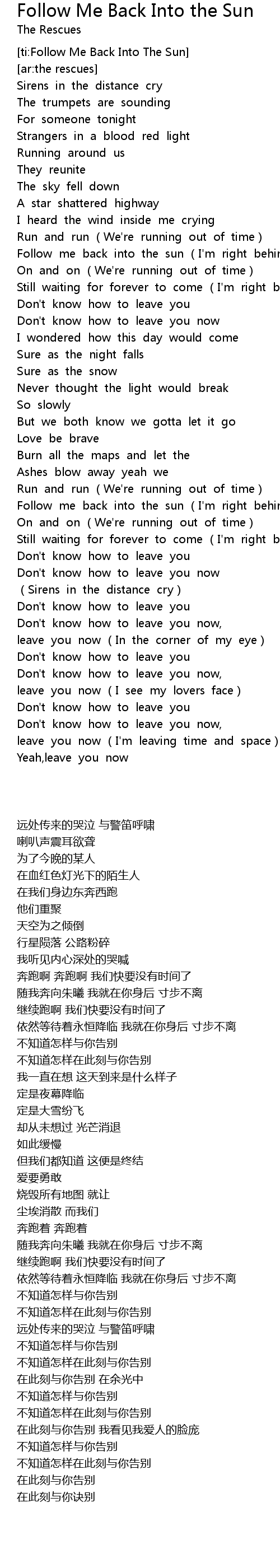 | [01:12.83] | Follow me back into the sun (I'm right behind you) |